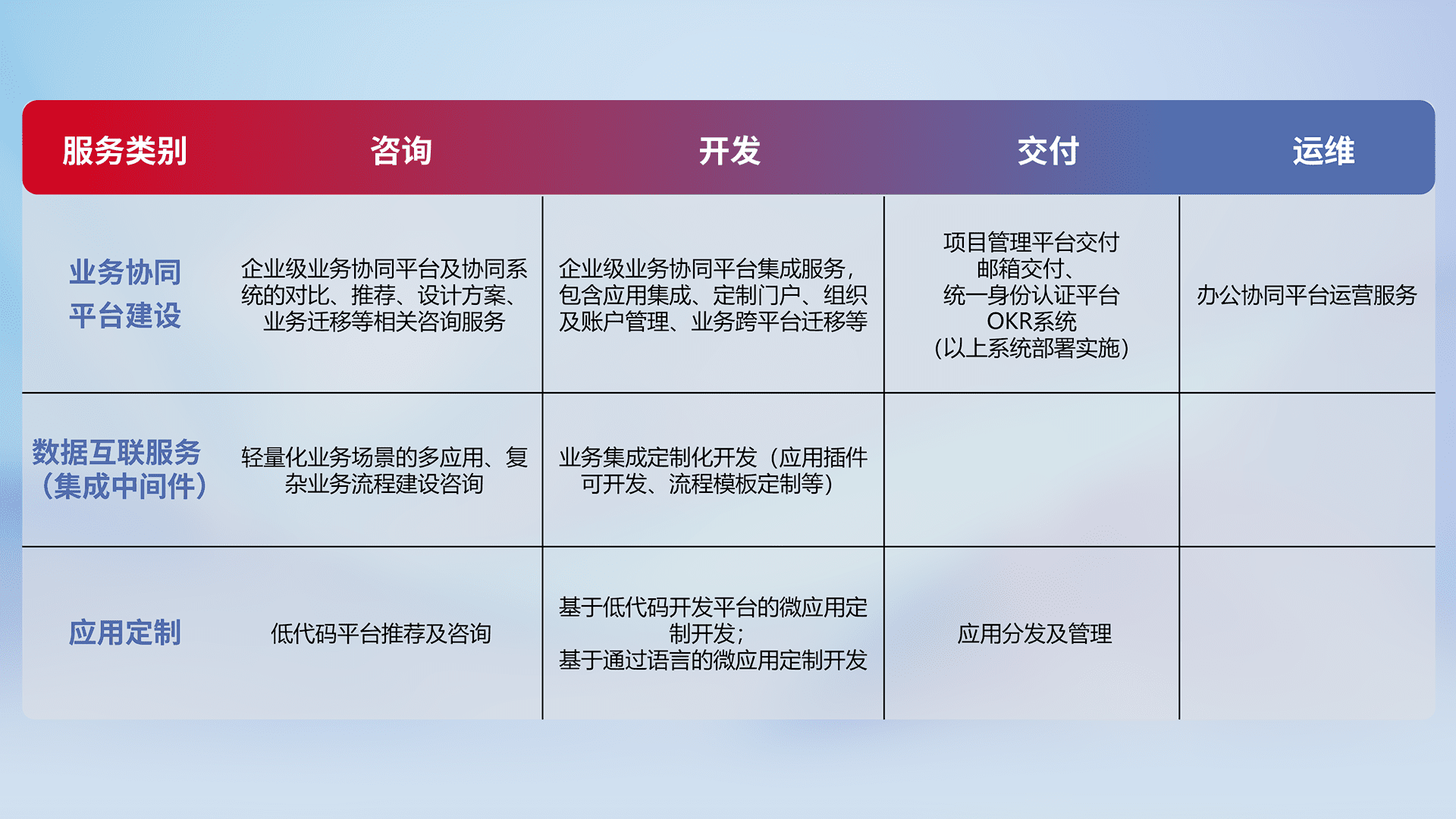 针对钉钉、、企微、、、IDaas等平台级产品提供产品的规划、、、、方案、、、交付、、定制化开发等服务,,,,实现如统一协同办公、、智能客户服务、、、、混合会议管理、、智能数据查询、、等业务场景,,,,实现数字化转型。。